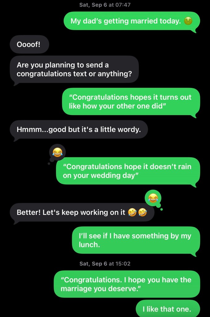 I wanted to hurt him back with a couple of sarcastic congratulations texts. It’s never too late not to send them. Wanna read them?